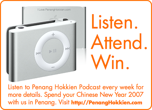 This coming Chinese New Year 2007, year of the big fat pig, I’ll be meeting listeners and also to give away an iPod shuffle. It has the engraving on the back that says “I Love PenangHokkien.com”. Do you want to be the winner? Listen to Penang Hokkien Podcast every week for more details!